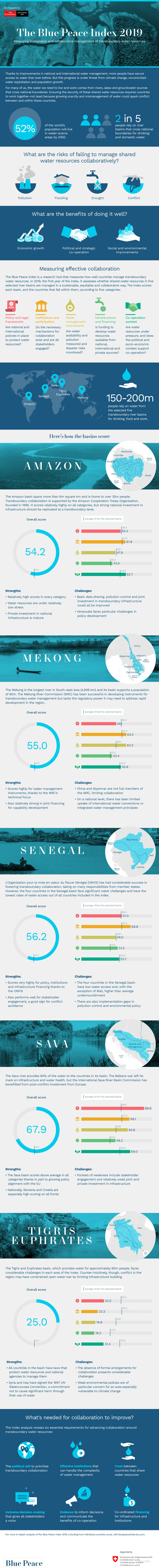 A visual summary of 2019 Blue Peace Index including the purpose of the index and scoring for each of the five basins. I worked closely with The EIU to develop a suite of summary visualisations of their data for the report, including a summary infographic for the report itself, as well as social media.